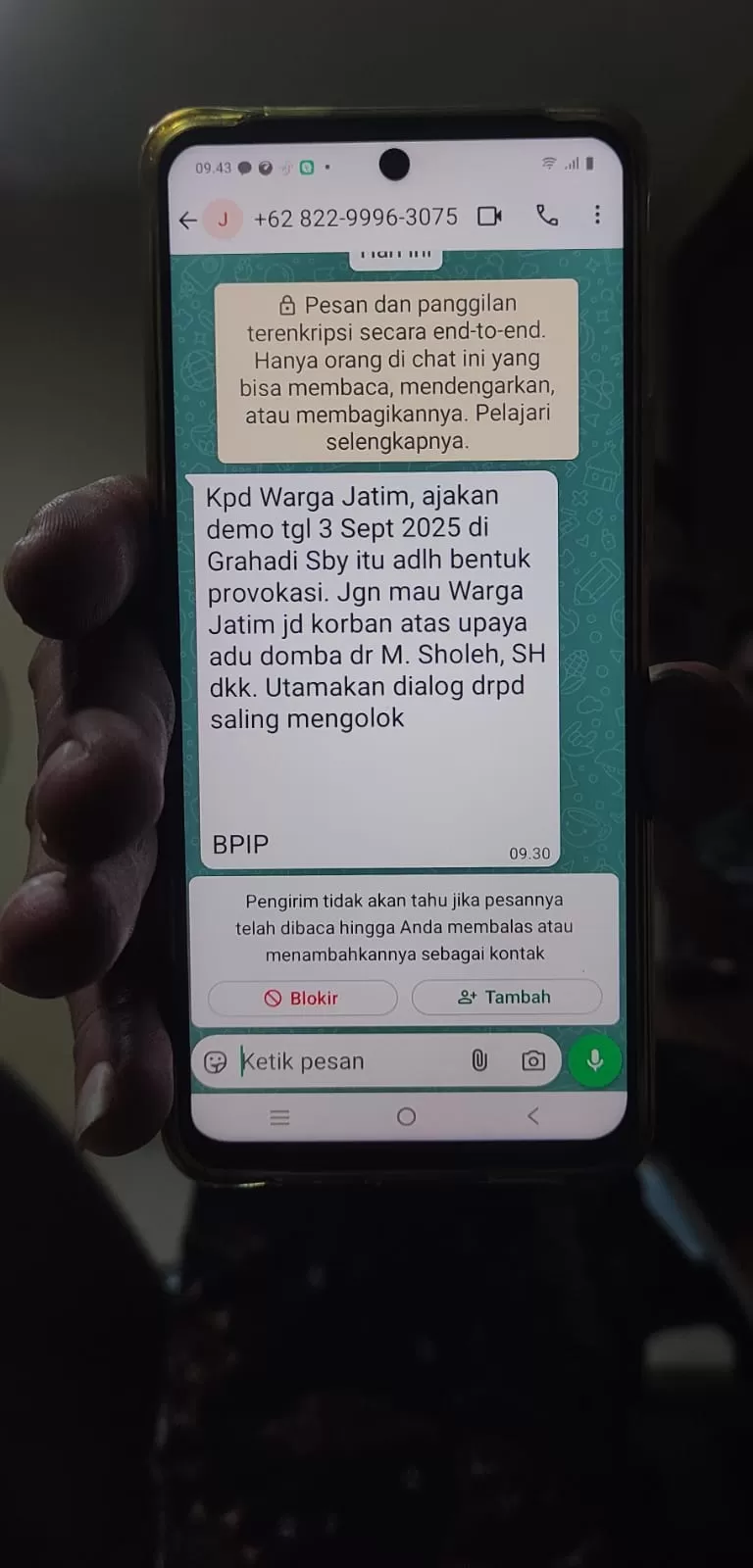 Mojokerto – Menjelang aksi unjuk rasa yang rencananya digelar di Gedung Negara Grahadi Surabaya pada 3 September 2025, masyarakat di Kota Mojokerto dihebohkan dengan beredarnya pesan berantai di aplikasi perpesanan. Pesan tersebut berisi imbauan agar warga tidak mengikuti ajakan demonstrasi, yang disebut-sebut bisa menimbulkan gangguan keamanan dan ketertiban.